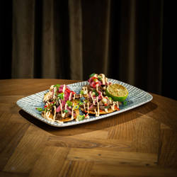 Ostegratinert NachosTacokjøtt, toppes med srirachamayo, vårløk, rømme og chunky ... 235,- |