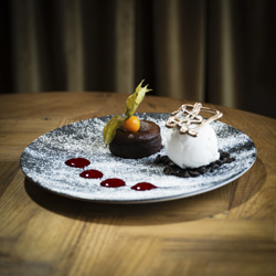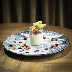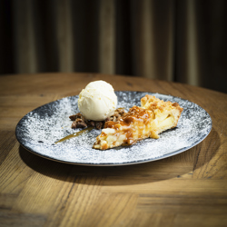 Lun EplekakeServeres med salt karamellsaus og vaniljeis på valnøttcrunch 149,- |