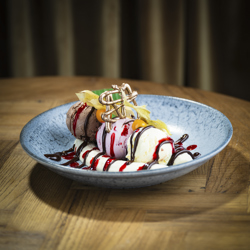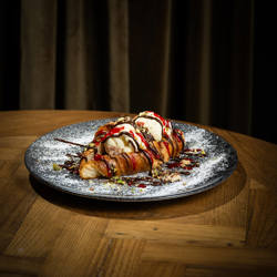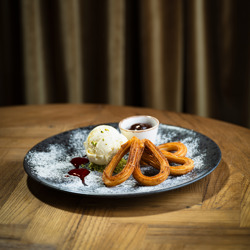 Langtidsbraisert Oksebrisketmed potetpuré, minigulrot, sopp og brokkolini. Fritert løk o... 310,- |