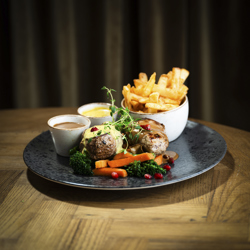Pepperstek 250gmed minigulrot, sopp, brokkolini, peppersaus og fries. 499,- |